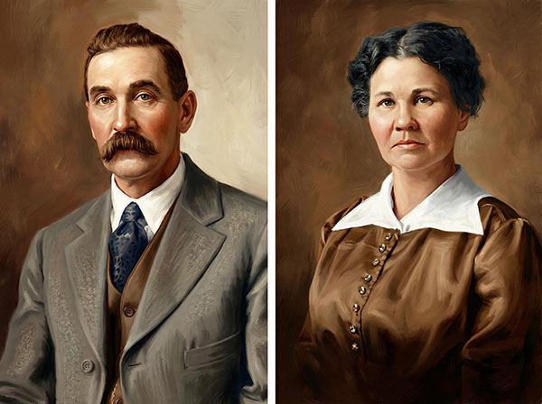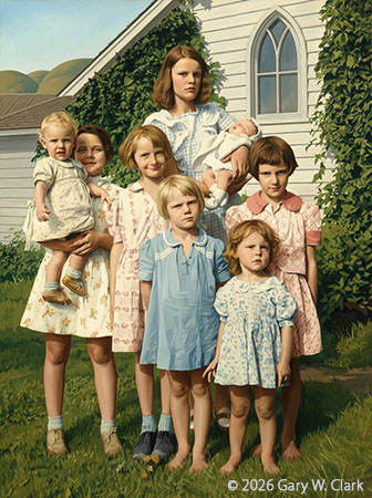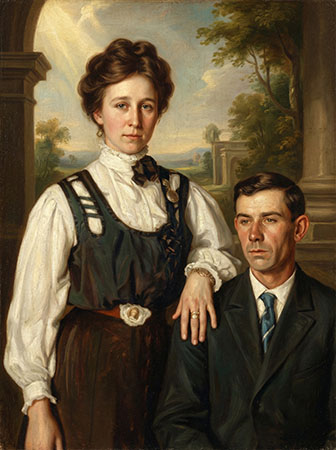 1927 Photograph Prompt: Paint this image in the American Gothic style by Grant Wood, do not change faces. (Gemini 3.0) |