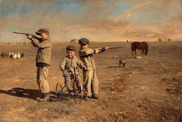 The 'do not change faces' statement was needed as the first attempt changed the people. This is truly a magnificent rendition. The only change it made was a typical Gothic element by Wood, the window in the building in the background. Trivia: The woman with the camera, too the picture of the boys with their guns in an open field, above. She was this author's grandmother. |